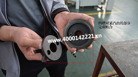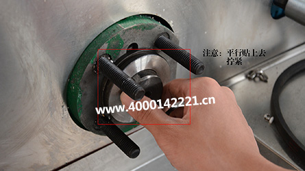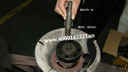 9.安裝機(jī)頭的操作過(guò)程;把加熱好的機(jī)頭,小心,燒好的機(jī)頭拿的時(shí)候需要特別注意安全。螺紋短的那頭擰進(jìn)去,把機(jī)頭的四個(gè)孔對(duì)緊機(jī)頭的四個(gè)孔,平行貼合上去。