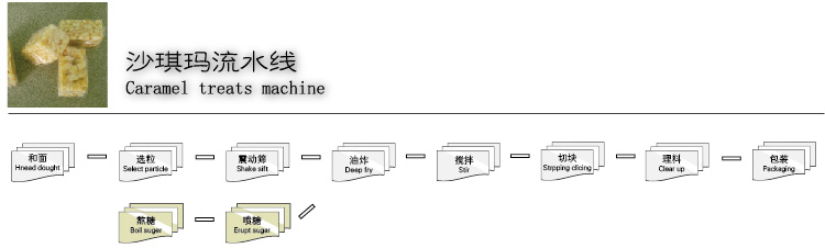 - Caramel treats producing line: 1. Make the dough, 2.ferment 3. Press 4.dusting wheat flour 5. Frying 6.boil sugar 7. spray sugar and mix 8. lift the materials 9. cut 10. arrange and pack