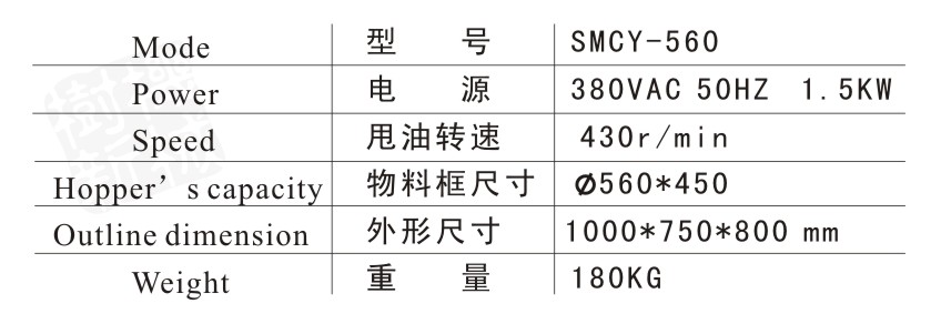 - 此甩油機與SMC-645成型機和SMCJ-35攪拌機配套使用,利用離心力,去除掉瓜或花生油炸好后的殘留油份.配套的兩個物料框可以直接用于油炸時使用. 配套成型機使用時,剛好半袋瓜子25斤炸一次,甩一次油,這樣循環操作